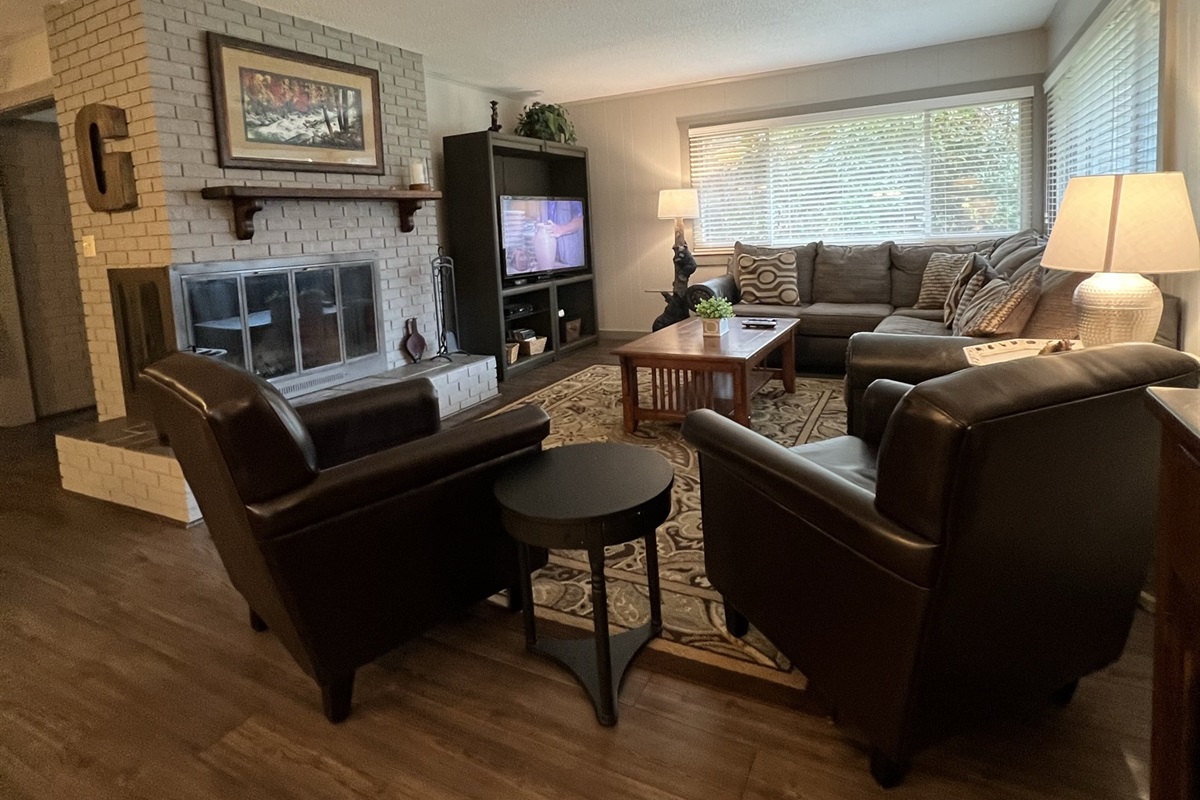 The living room features a wood burning fireplace, flat screen television, Blu-Ray DVD player, cable and free WIFI. The large sectional sofa has a queen sleeper sofa within.