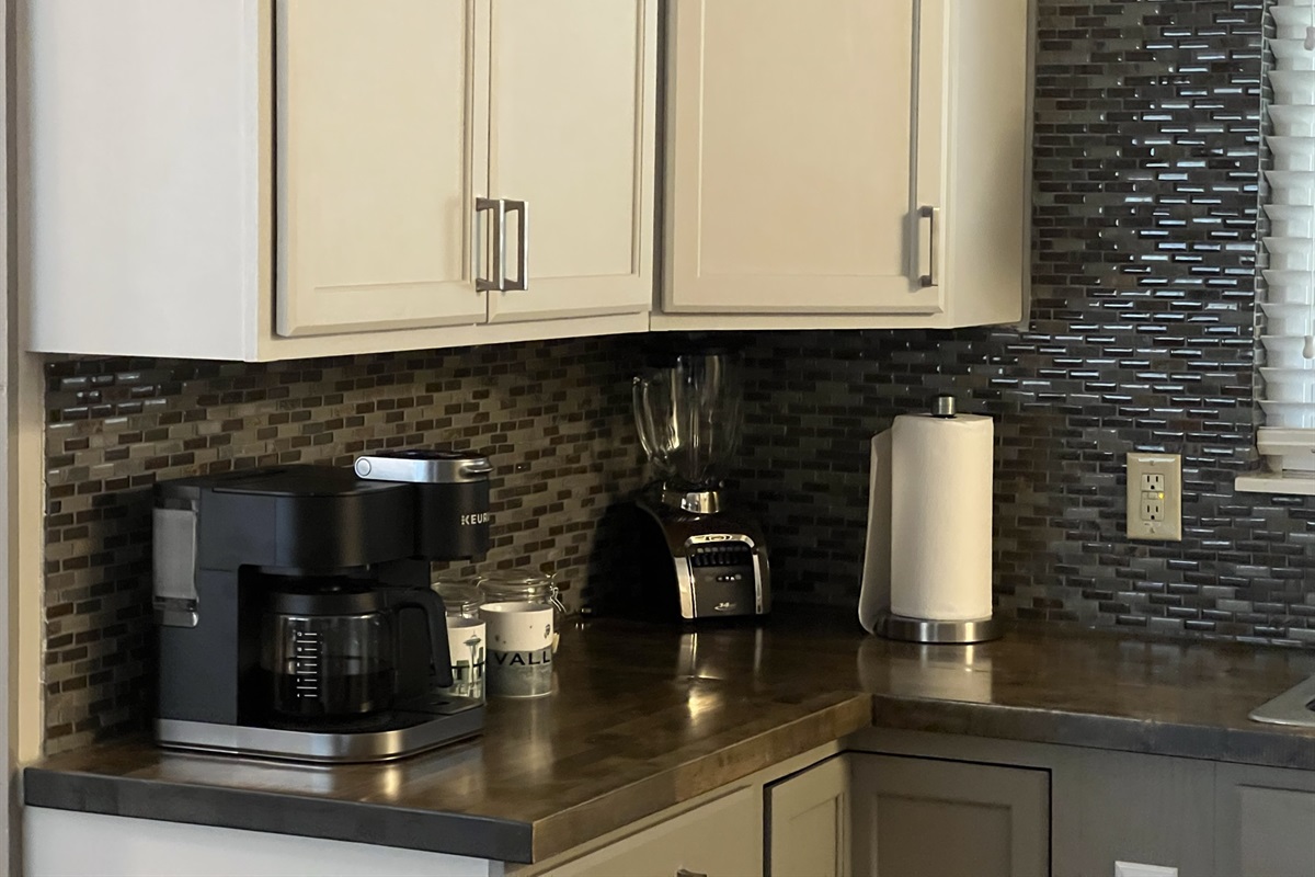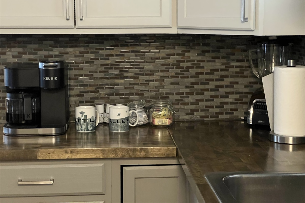 The kitchen is fully stocked with pots/pans, dishes, cups and silverware. There is a stove, full-size refrigerator, microwave, coffee pot, toaster, and blender. The adjoining laundry room has a full size washer and dryer.