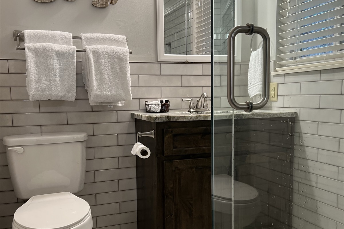 Bedroom 1 is outfitted with a king sized bed, dresser, TV with cable and Blu-Ray DVD player. There is also a double closet. The attached bathroom offers a single vanity and walk-in shower.