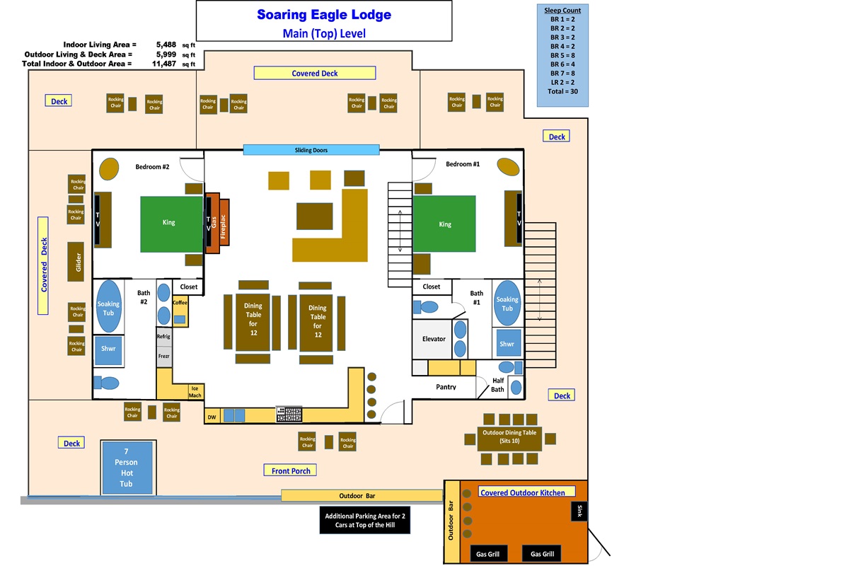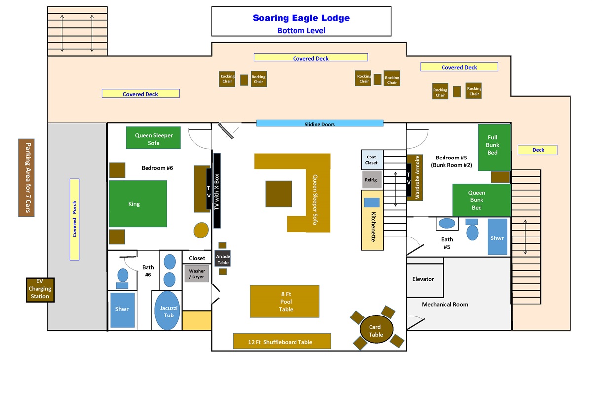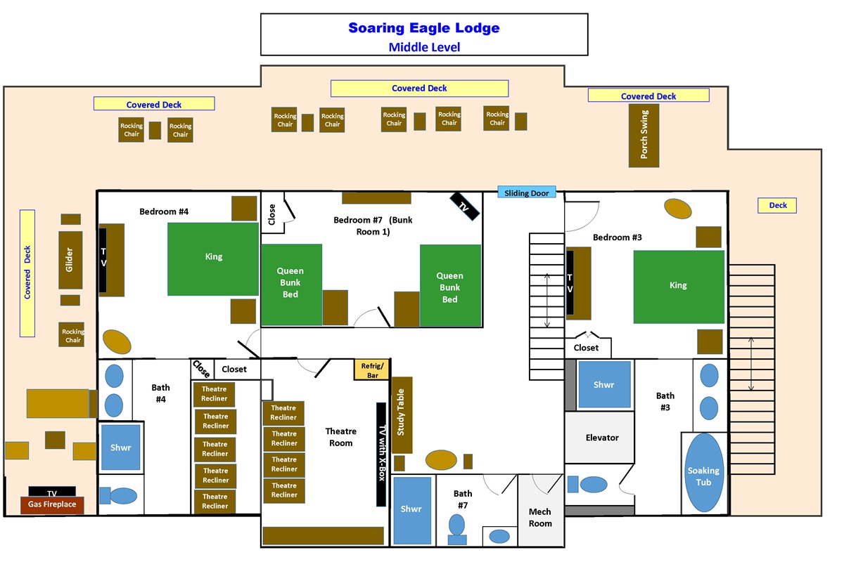 The longer you stay, the bigger your discount! Rest in the relaxing home known as Soaring Eagle Lodge. It is a beautiful, luxury 7 bedroom lodge situated high on the Forest Springs Mountain right in the middle of Gatlinburg. The Lodge has spectacular, breath taking views of the mountains and the Park from its 3 decks and outdoor areas. This custom built home was designed for large multi-generational families that includes an ELEVATOR for ease of move-in and access to the three levels for those with limited mobility.